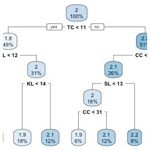 At the topmost node (node 0) of the regression tree diagram generated by CART (Fig. 2), the root node showed the overall body weight of chickens to be 2 kg. The node was split into two sub-groups based on TC, with a cut-off point of 11 cm. For the first sub-group, where TC was less than 11 cm, the average body weight was 1.8 kg, representing 49 % of the flock. When TC was greater than 11 cm, the obtained body weight was 2.2 kg, representing 51 % of the flock. The first sub-group of the tree was further split into two sub-groups based on KL, with a cut-point of 12 cm. When the KL was less than 12 cm, the mean BW was 1.6 kg, representing 18 % of the flock. When KL is greater than 12 cm, the mean BW is 2 kg, representing 31 % of the flock. This part of the tree was further divided into two sub-groups based on CC, with a cut-point of 33 cm. The results further revealed that, when the CC is less than 33 cm, the obtained BW is 2.1 kg, representing 26 % of the flock. When CC is greater than 33 cm, the obtained mean BW is 2.4 kg, representing 25 % of the flock. This part of the tree was divided into two sub-groups based on SL, with a cut-point of 13 cm. When the SL is less than 13 cm, the obtained BW was 2 kg, representing 18 % of the flock. When SL is greater than 13 cm, the obtained BW was 2.2 kg, representing 8 % of the flock.