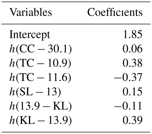 Meanwhile, the sixth term, TC, had a cut-point of 13.9 cm, with a negative coefficient of −0.11. The last term was KL, with a positive coefficient of 0.39. The basic functions that reduce the model's performance obtained after the forward and backward pass stages were eliminated due to the GCV in MARS modeling.