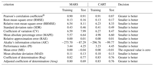 The best model between MARS and CART was determined by calculating the goodness-of-fit test criteria (Çelik and Yilmaz, 2018; Bila et al., 2023). The following goodness-of-fit criteria were calculated: