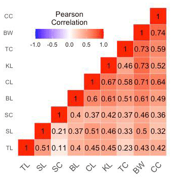 Figure 1 depicts correlation coefficients for predicting the correlation between body weight and the chickens' measured linear body measurements. The body weight of the chickens was positively and highly correlated (p<0.01) with CC (0.74), TC (0.73), KL (0.73), CL (0.71), and BL (0.61). However, it was moderately and positively correlated (p<0.05) with shank length (SL) (0.50), SC (0.46), and TL (0.43). On the other hand, the KL showed a positive highly significant correlation (p<0.01) with CL (r=0.67).