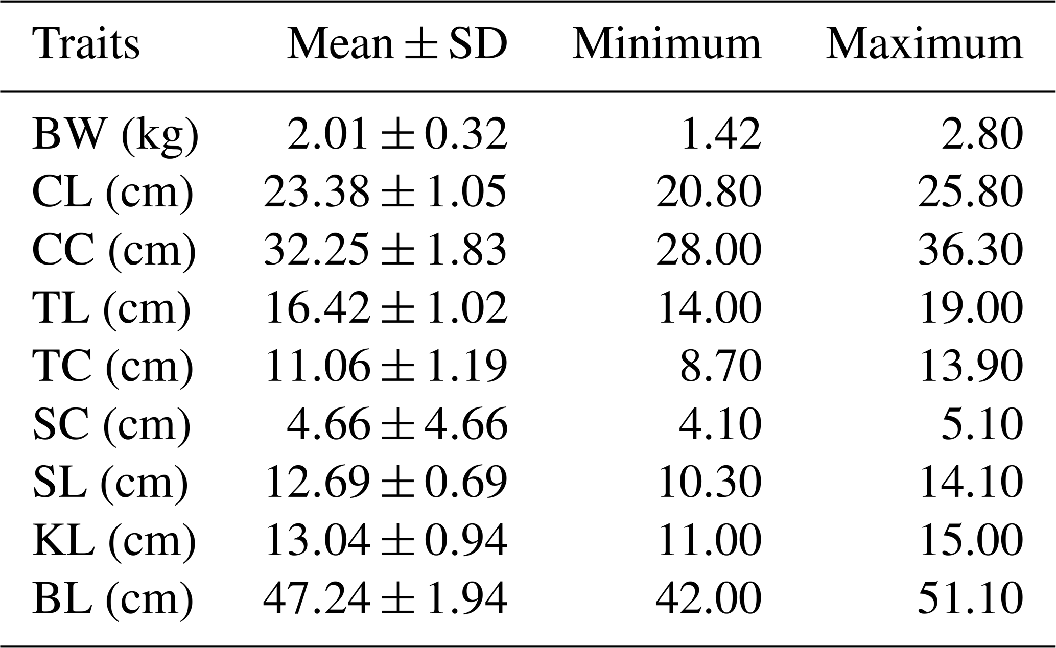 Table 1Descriptive statistics of body weight and linear body measurements of chickens.