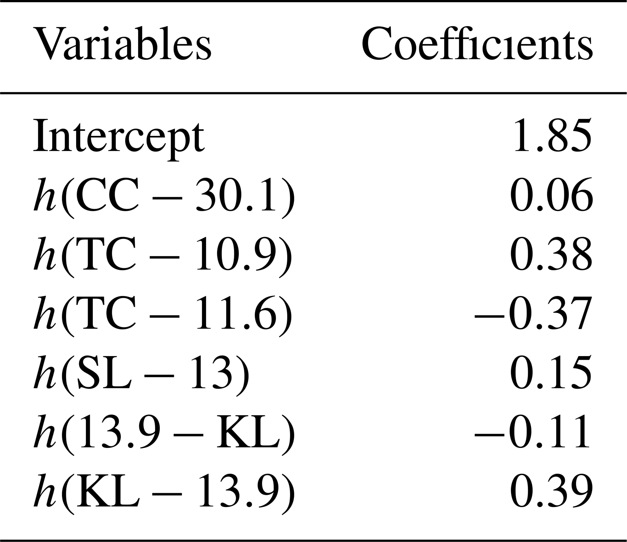 Meanwhile, the sixth term, TC, had a cut-point of 13.9 cm, with a negative coefficient of −0.11. The last term was KL, with a positive coefficient of 0.39. The basic functions that reduce the model's performance obtained after the forward and backward pass stages were eliminated due to the GCV in MARS modeling.