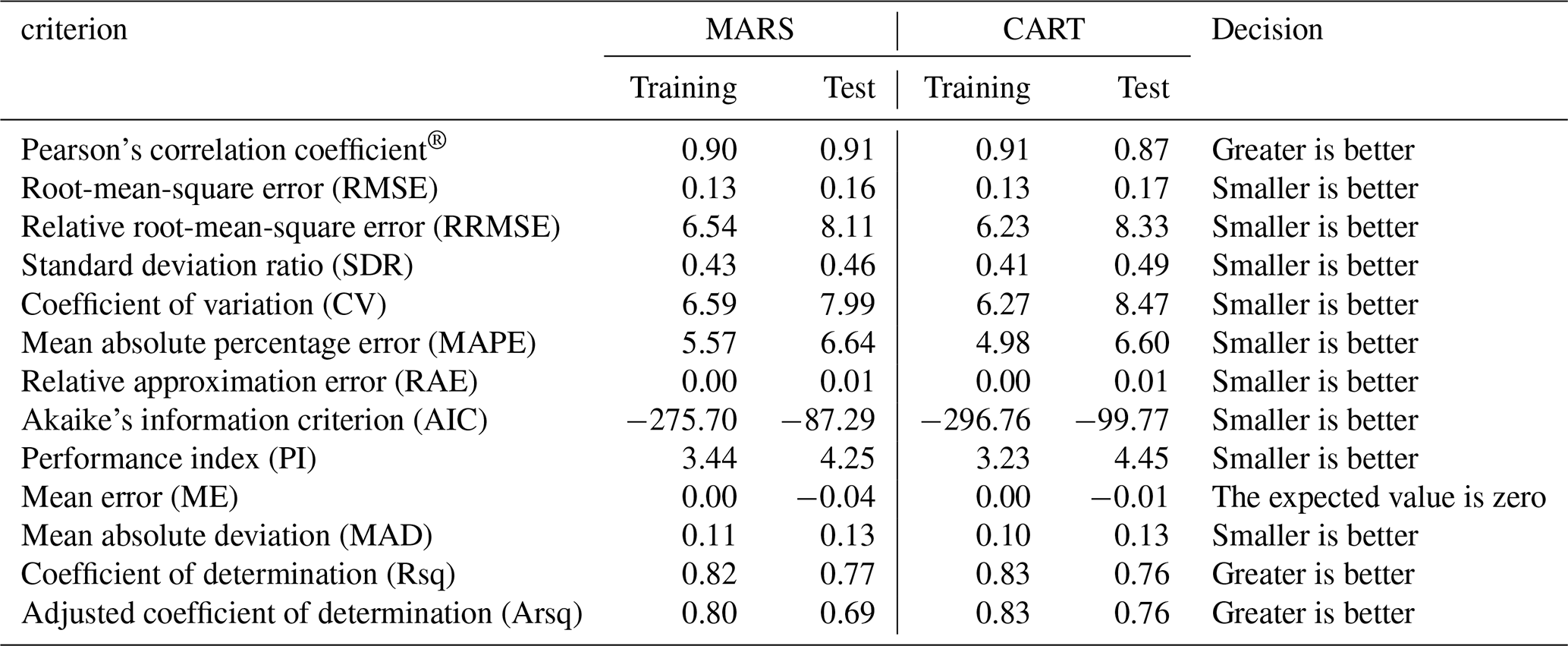 The best model between MARS and CART was determined by calculating the goodness-of-fit test criteria (Çelik and Yilmaz, 2018; Bila et al., 2023). The following goodness-of-fit criteria were calculated: