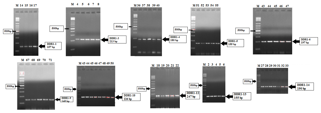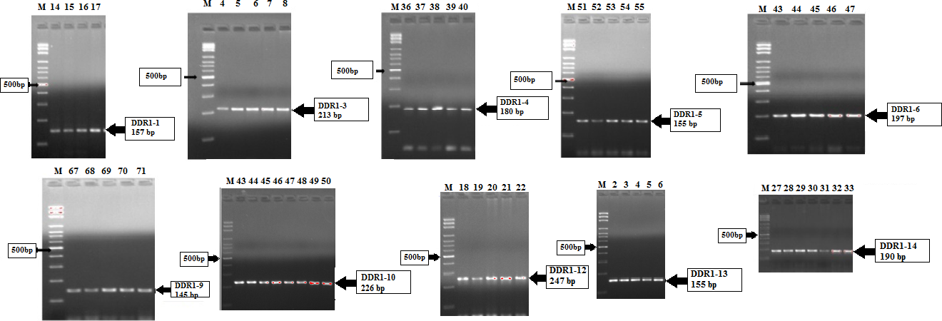 Figure 1Agarose gel electrophoresis (1.5 %) of PCR products of the DDR1 gene: exon 1 (157 bp), exon 3 (213 bp), exon 4 (180 bp), exon 5 (155 bp), exon 6 (197 bp), exon 9 (145 bp), exon 10 (226 bp), exon 12 (247 bp), exon 13 (155 bp), and exon 14 (190 bp). M: Marker DNA (100 bp).