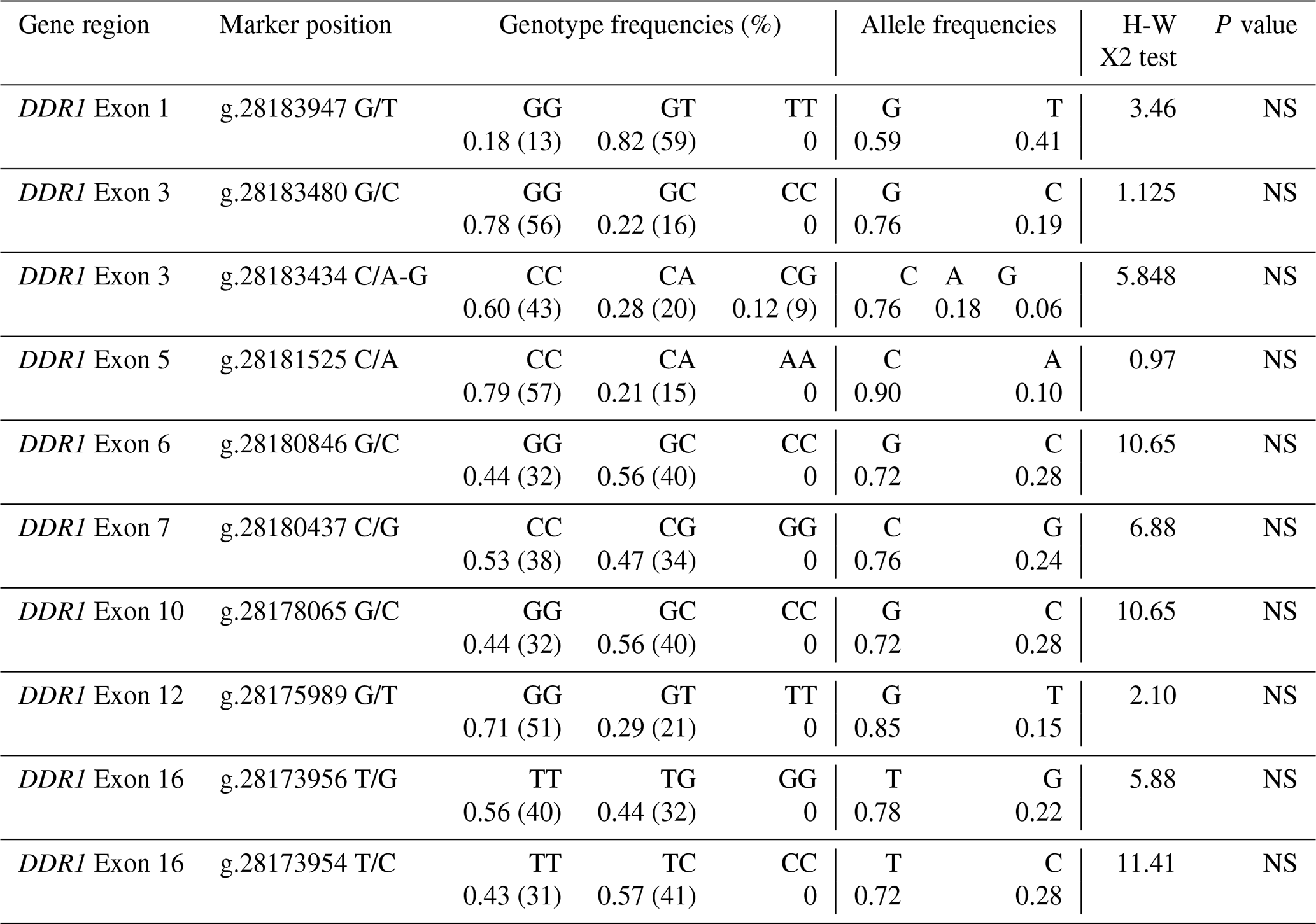 For each exon region of the DDR1 gene, the sequence results of the DNA samples and the reference sequence found in NCBI were aligned in the BioEdit 7.2.5 program, and nucleotide variation differences were determined. In addition, genotype and allele frequencies were calculated to determine whether the distribution of genotype frequencies in polymorphic regions was in Hardy–Weinberg equilibrium (Table 3). As a result of the sequence analysis, a total of 10 polymorphic regions were detected in different regions of the DDR1 gene, including g.28183947 G/T, g.28183480 G/C, g.28183434 C/A-G, g.28181525 C/A, g.28180846 G/C, g.28180437 C/G, g.28178065 G/C, g.28175989 G/T, g.28173956 T/G and g.28173954 T/C.