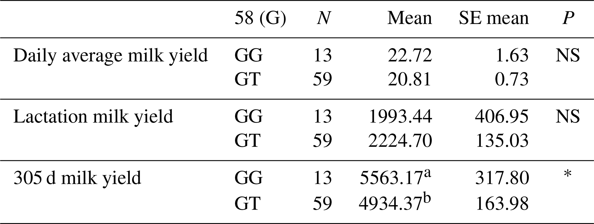 Table 3Mean and standard error values for the polymorphic region at position 58 in the 1 exon of the DDR1 gene in terms of yield characteristics of Simmental cattle.
