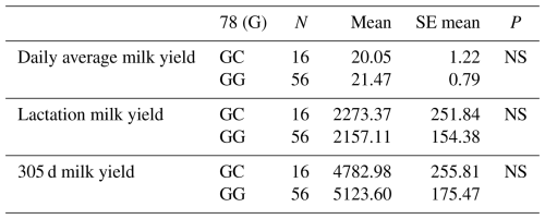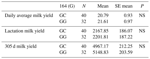 Table 9Mean and standard error values for the polymorphic region at position 164 in the 10 exon of the DDR1 gene in terms of yield traits of Simmental cattle.