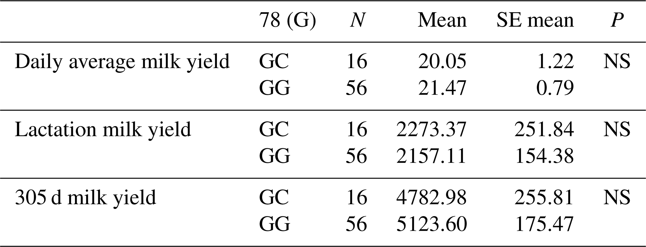 Table 4Mean and standard error values for the polymorphic region at position 78 in the 3 exon of the DDR1 gene in terms of yield traits of Simmental cattle.