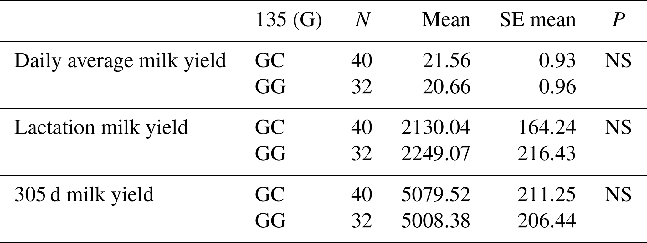 Table 7Mean and standard error values for the polymorphic region at position 135 in the 6 exon of the DDR1 gene in terms of yield traits of Simmental cattle.