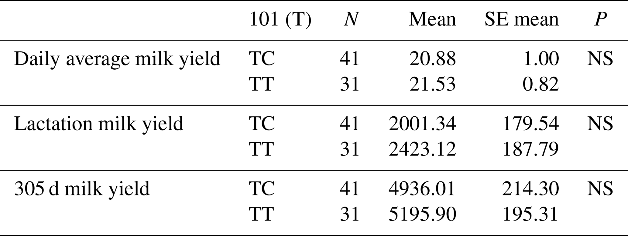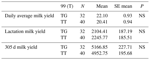 Table 8Mean and standard error values for the polymorphic region at position 103 in the 7 exon of the DDR1 gene in terms of yield traits of Simmental cattle.