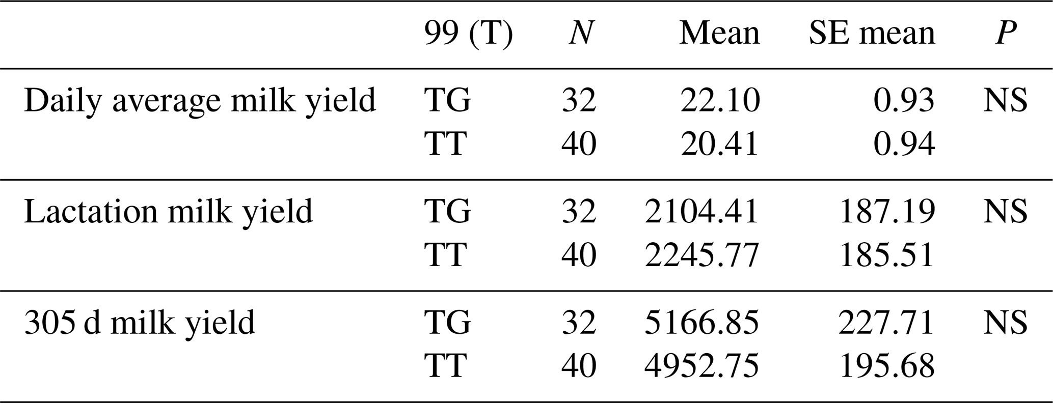 Table 10Mean and standard error values for the polymorphic region at position 99 in the 12 exon of the DDR1 gene in terms of yield traits of Simmental cattle.