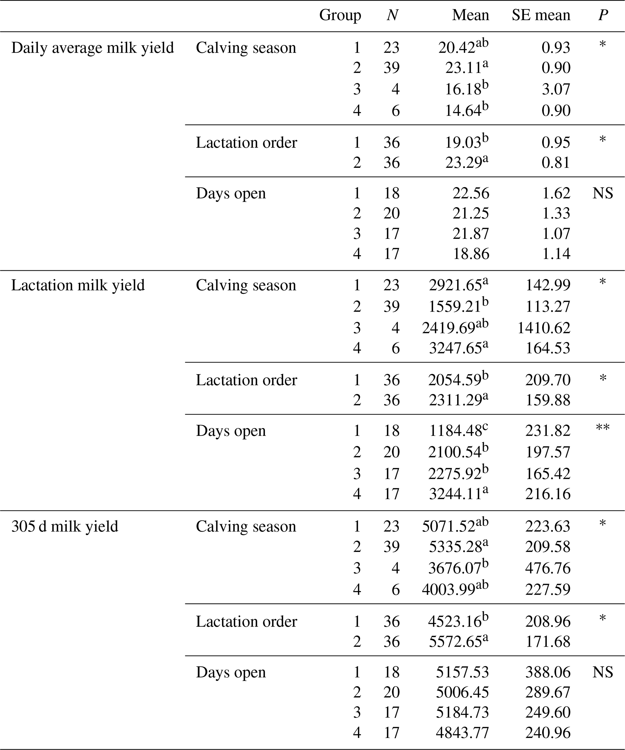 Table 13Mean and standard error values of the effects of Simmental cattle genotype, lactation order, number of days open to vaccination and calving seasons on average daily milk yield, lactation milk yield and 305 d milk yield.