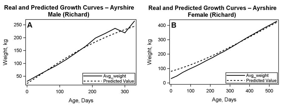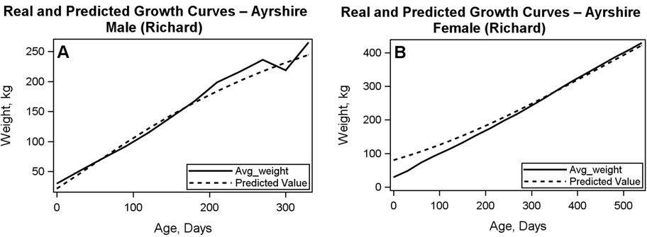 The prediction of the Richard model for male Ayrshire cattle is as follows: