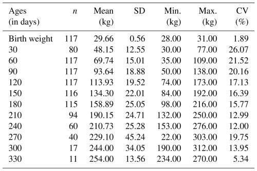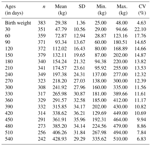 Table 3The descriptive statistics of live weight of female Ayrshire cattle at different ages.
