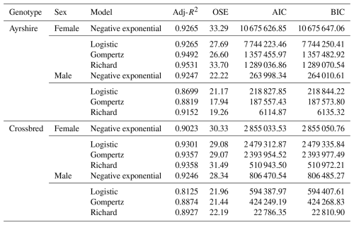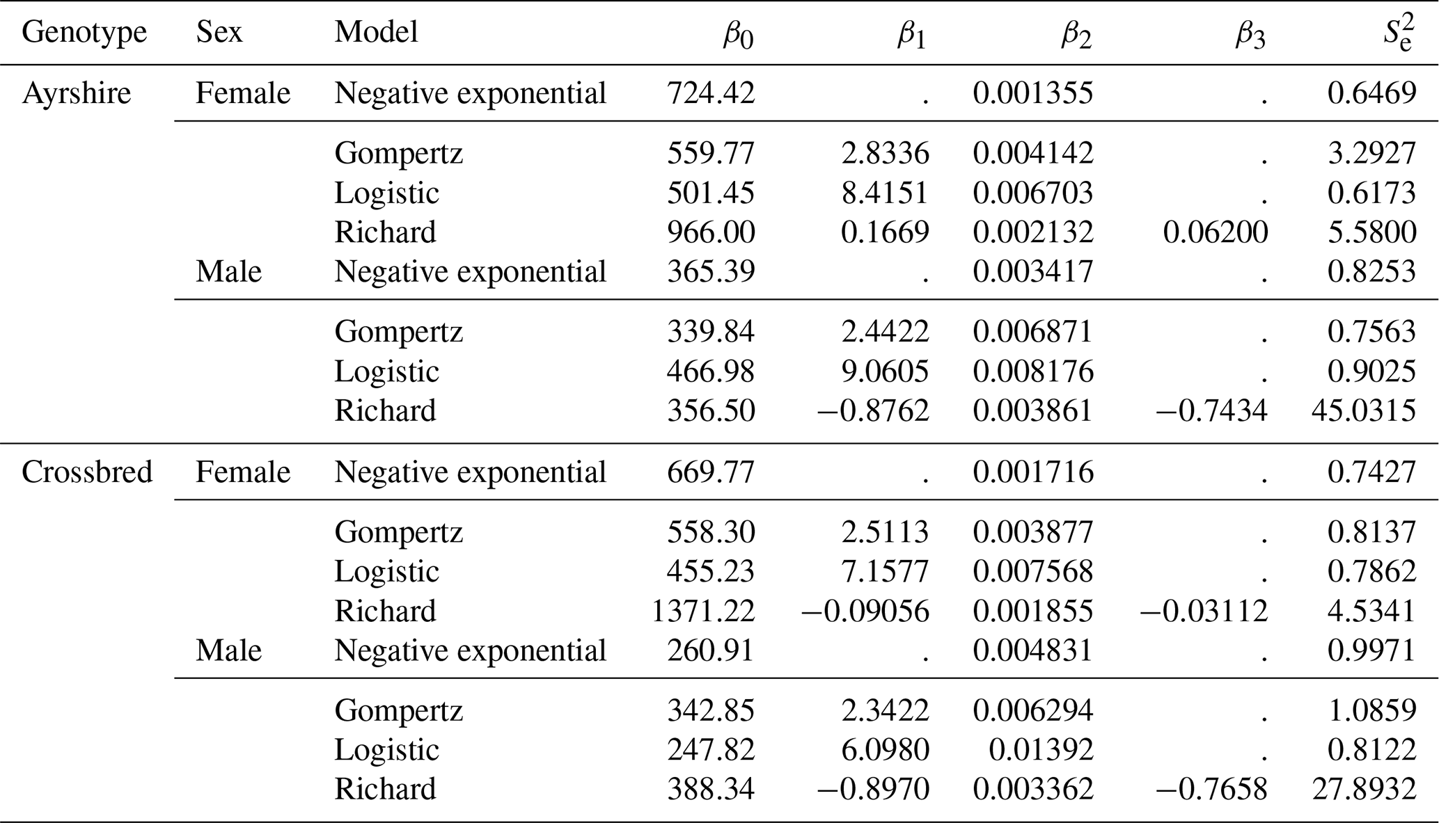 Table 7Regression coefficients and growth curve parameters for body weight of Ayrshire cattle and crossbred cattle (F1). A dot (.) denotes that a parameter is not included in the model structure. These parameters are not missing or undefined; they are simply not part of the functional form of the respective nonlinear model. Therefore no estimate exists by design.