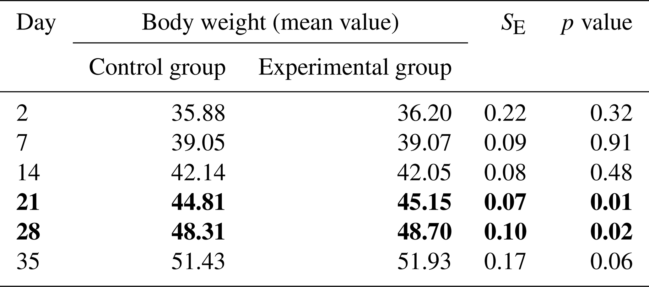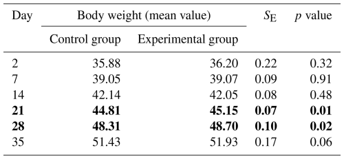 Table 1Body weights of calves from the experimental and control groups (kg). Bold values indicates significant differences.