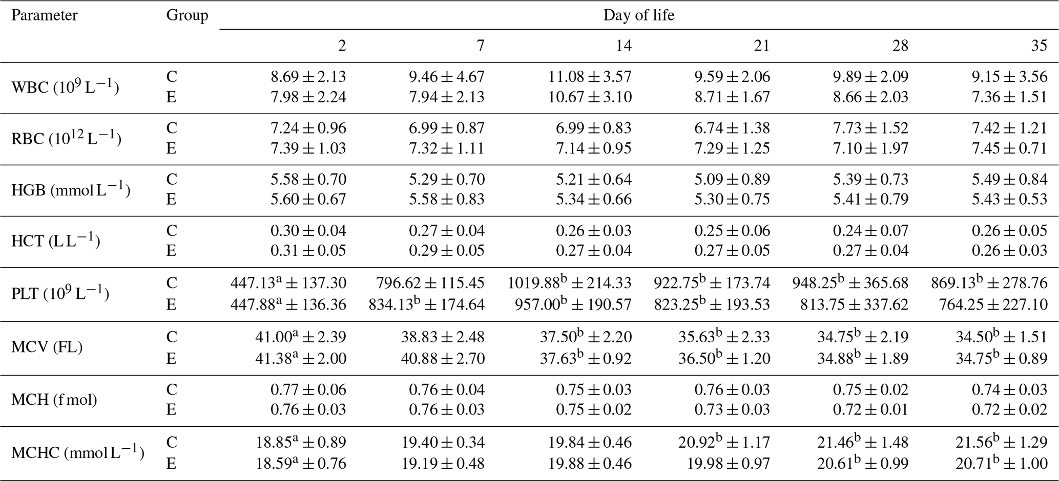 Mean red blood cell haemoglobin mass (MCH) was similar in both study groups and all periods from 2 to 35 d of age. In contrast, the value of mean haemoglobin per unit red blood cell volume (MCHC) increased with age in both groups. In the control group, the value of MCHC was higher (p<0.05) at 21, 28, and 35 d of observation compared to 2 d of life, and in the experimental group (p<0.05) at 28 and 35 d with respect to baseline (Table 3). In this case, no statistically significant differences were observed between the study groups at different periods.