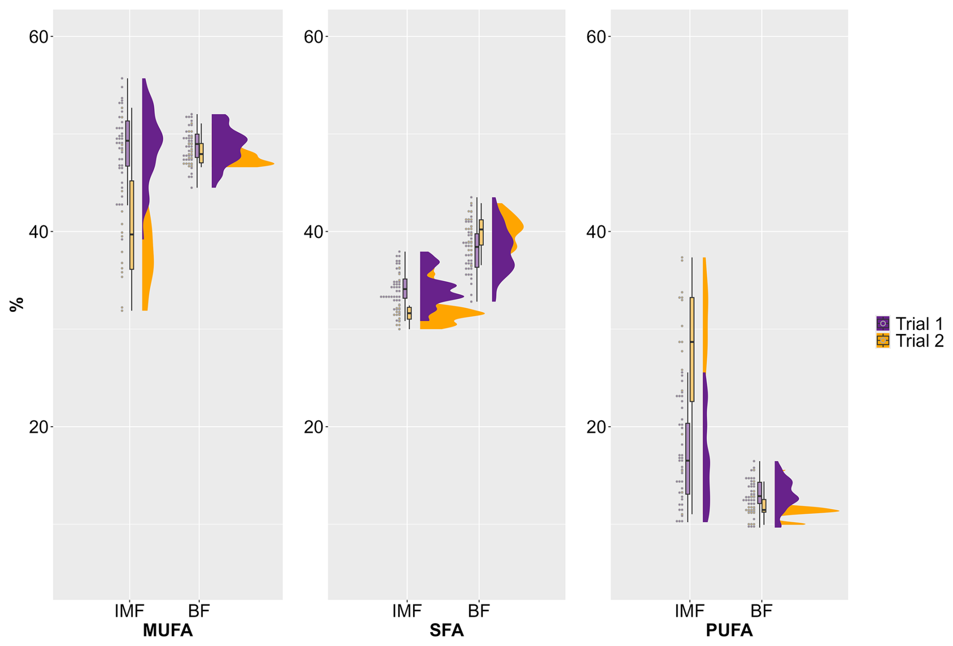 For SFAs, less distinct differences between the trials were detected for both IMF and BF (Fig. 1). In contrast, clear differences between the two trials can be seen for the proportion of PUFAs in IMF. While the average for the first trial was 17 %, it was 27 % in the second trial. Furthermore, a particularly large variation between individual animals can be observed in both trials for the amount of PUFAs in IMF. In contrast, there were almost no differences in the PUFA content of the BF between the two trials, and the variation was clearly lower (Fig. 1).