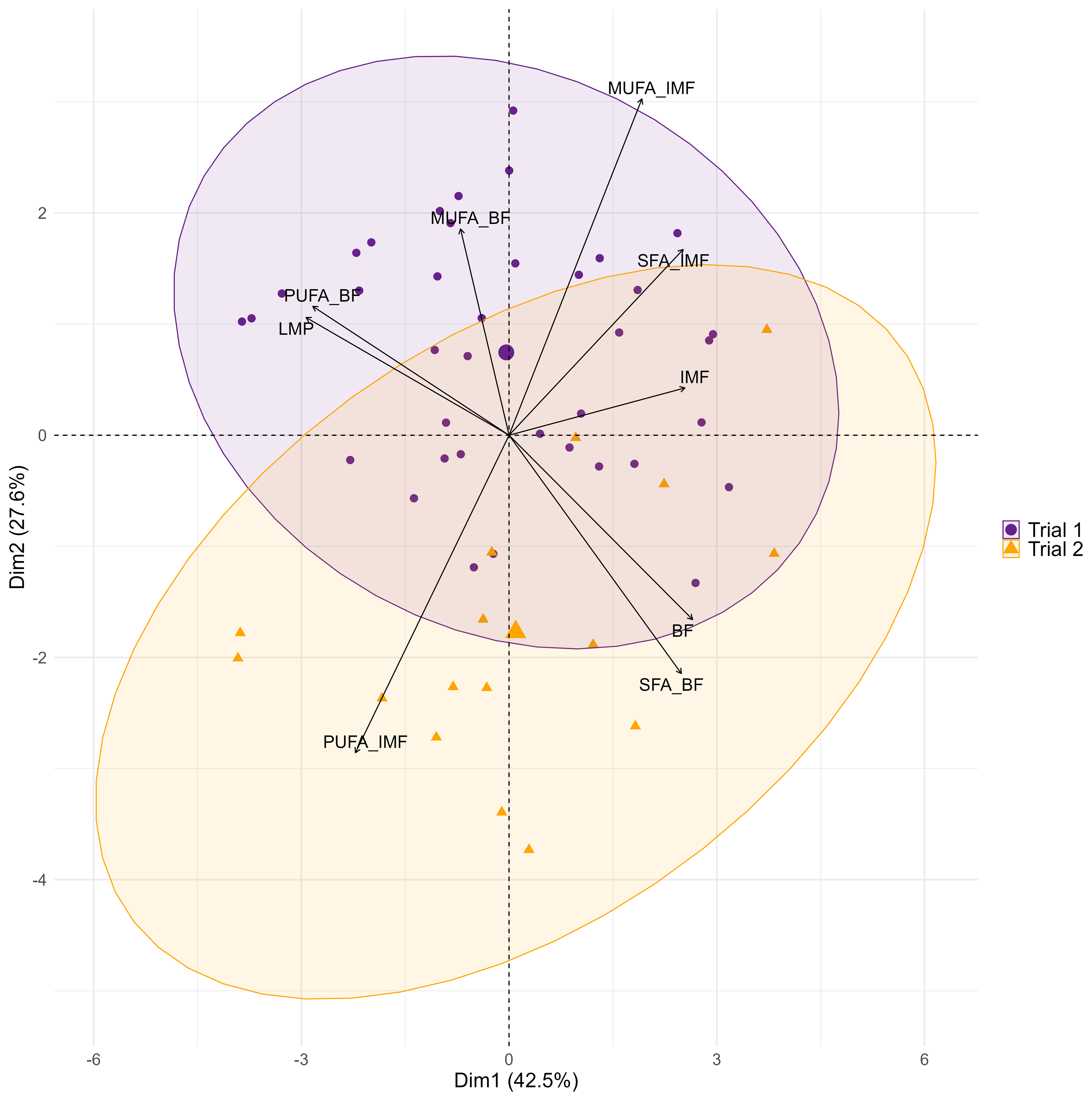 Figure 2Bi-plot of principal component analysis of selected target variables of fatty acid composition, carcass, and meat quality in two consecutive trials with Angler Saddleback pigs (n=58). Abbreviations: BF, backfat; IMF, intramuscular fat; LMP, lean meat percentage; MUFA, monounsaturated fatty acid; PUFA, polyunsaturated fatty acid; SFA, saturated fatty acid.
