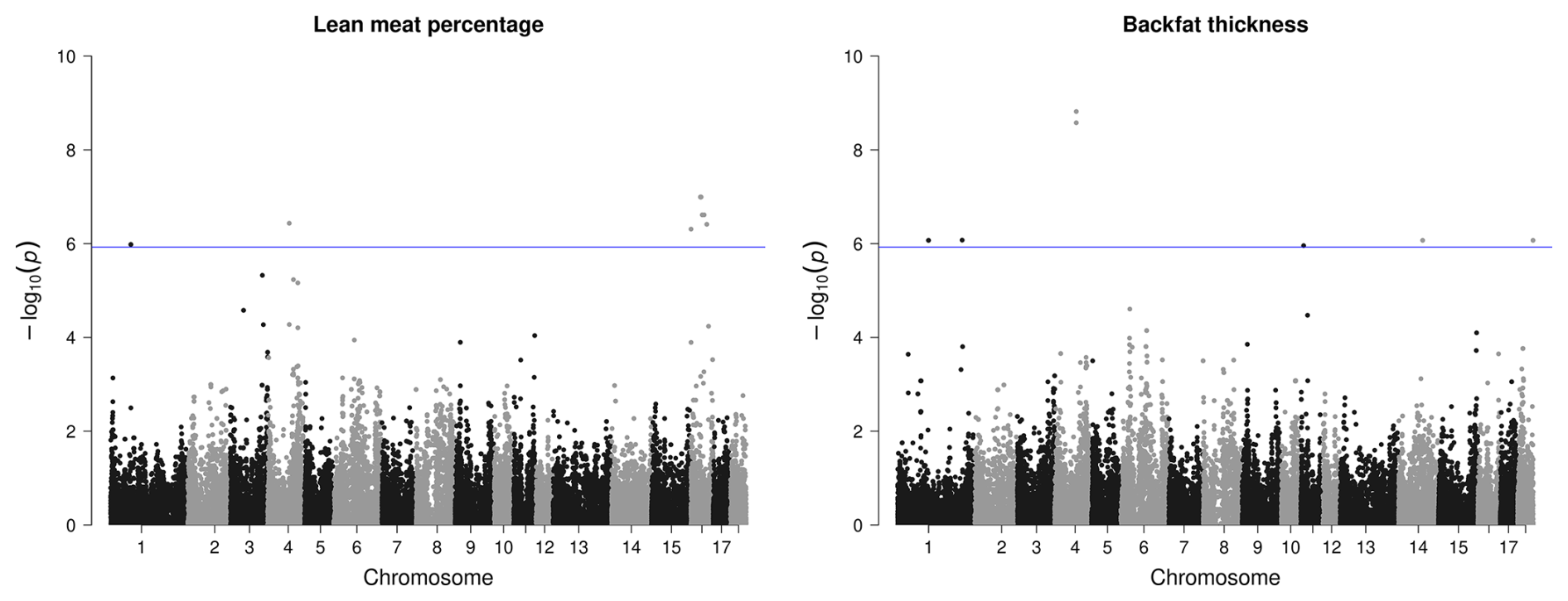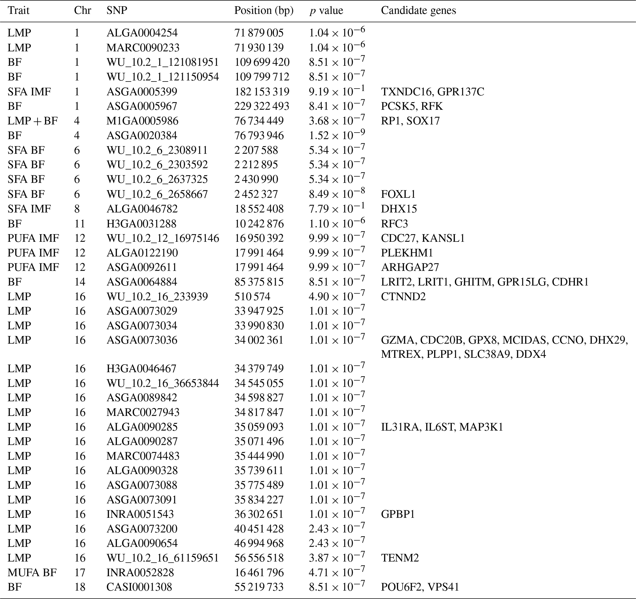 Most SNPs that passed the significance threshold were associated with LMP; they were mainly located on SSC16 with a QTL region between 33.9–56.5 bp. This region was found to harbor 15 different candidate genes (Table 3). Seven significant SNPs distributed over SSC1, SSC4, SSC14, and SSC18 were found to be related with the BF thickness. In view of this trait, the region on SSC4 with two variants stands out due to its comparatively high significance (Fig. 3) and two identified candidate genes.