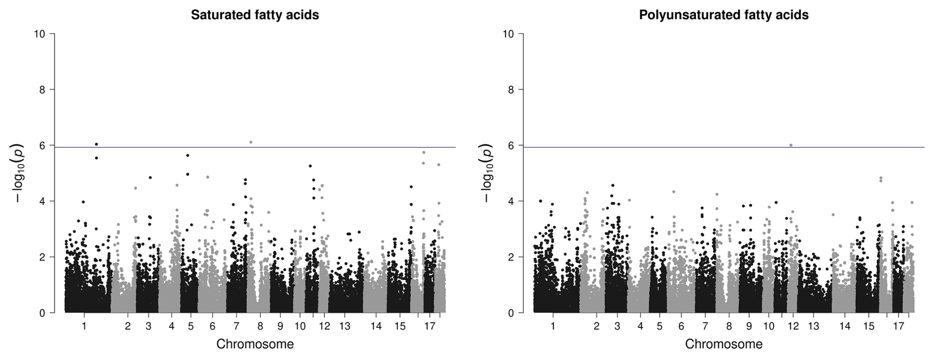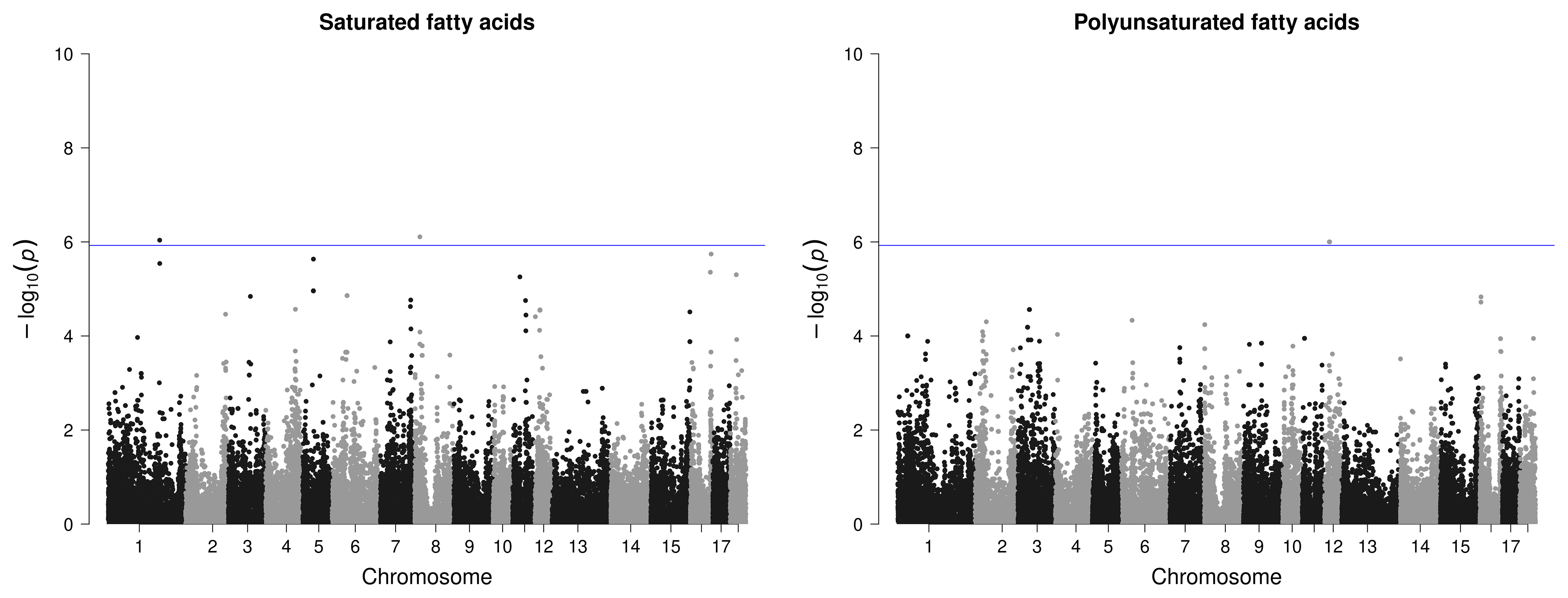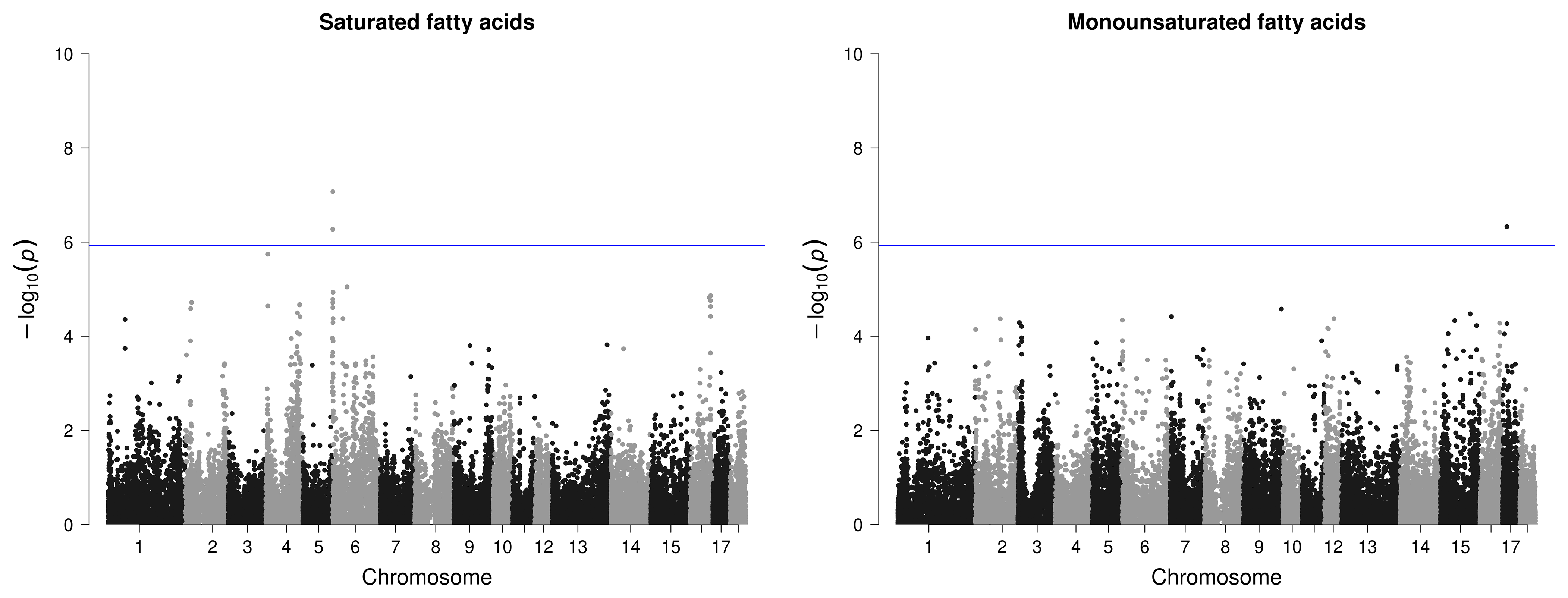 Figure 4Manhattan plots of genome-wide association studies for fatty acid composition in intramuscular fat in two trials with female and castrated Angler Saddleback pigs (n=58).