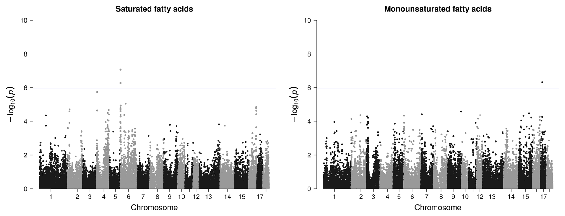 For the proportion of MUFAs in BF, only one SNP passed the threshold on SSC17, which is clearly distinguishable from the other variants (Fig. 5). However, no candidate gene was found here. For SFA in BF, the region on SSC6 (2.2–2.4 bp) was identified as relevant with four significant variants (Fig. 5) but only with one potential candidate gene.