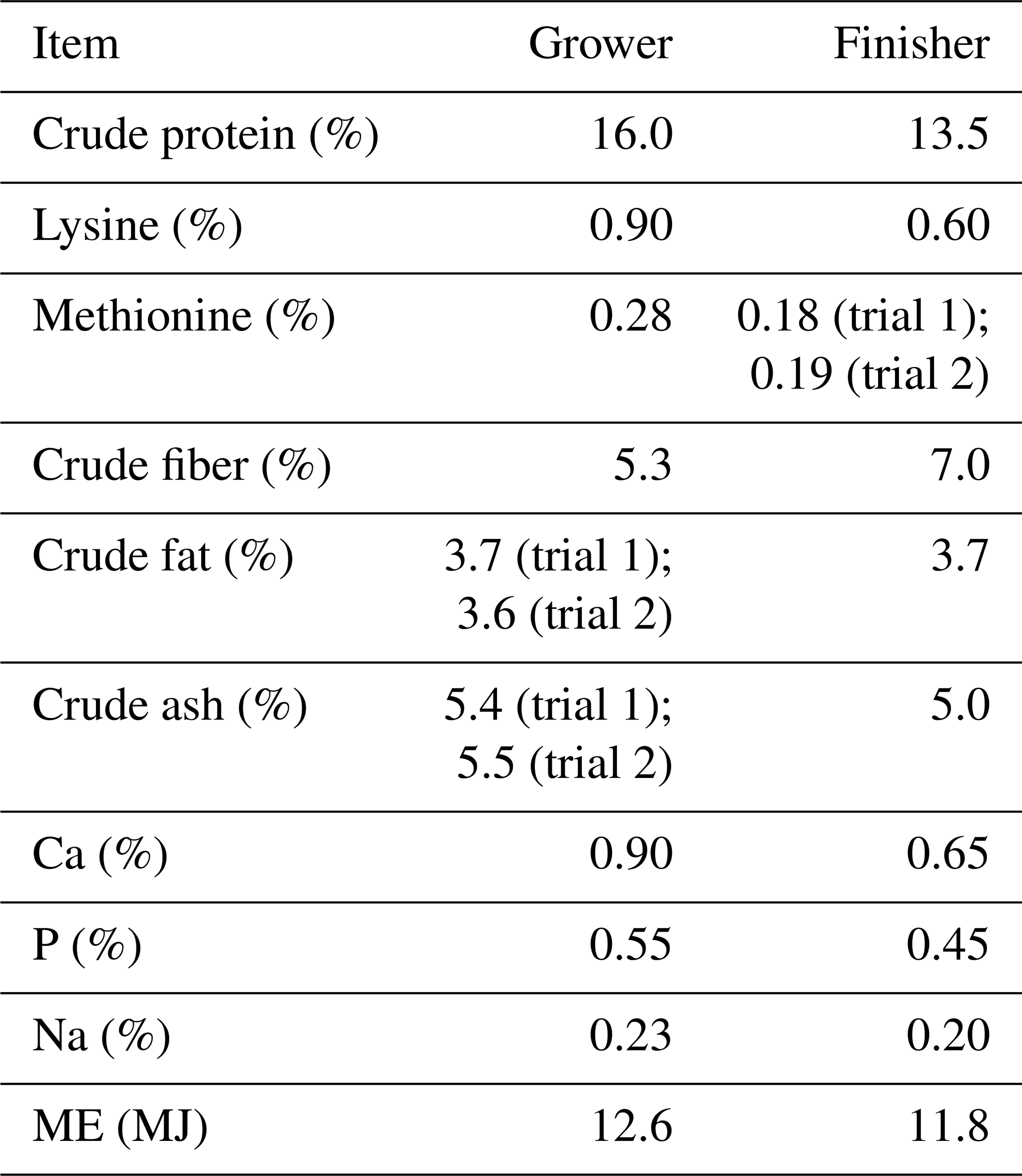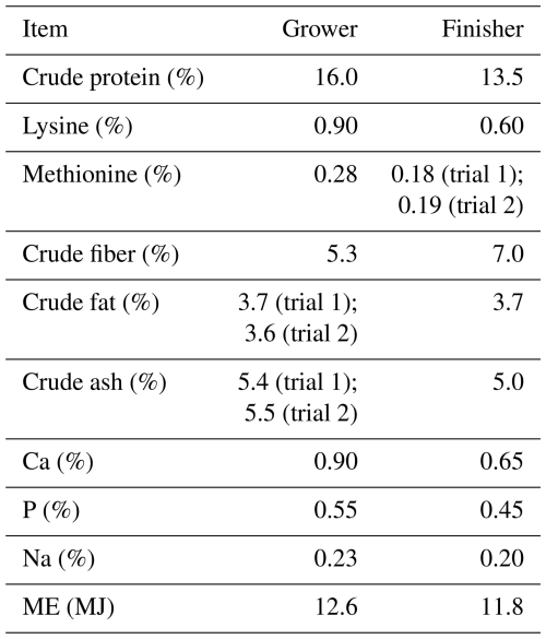 Table 1Nutrient and energy content of the grower and finisher diets (based on 88 % dry matter) according to feed declaration for two consecutive trials with Angler Saddleback pigs (n=58).