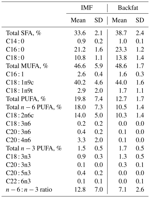 On average, an IMF amount of M=2.6 % (SD=0.8, CV=30.4) was reached. The fatty acid composition of IMF in the loin muscle was dominated by MUFAs (M=47 %). Oleic acid (C18 : 1n9c) represents by far the most abundant single fatty acid within this fraction (Table 2). SFAs formed the second-largest class of intramuscular fatty acids (M=34 %), with palmitic acid (C16 : 0; M=21 %) followed by stearic acid (C18 : 0; M=11 %) having the highest proportions. Overall, PUFAs had the lowest proportion in the intramuscular fatty acid composition (M=20 %) dominated by linoleic acid (C18 : 2n6c). The n−6 : n−3 ratio is averaged at 13, as shown in Table 2.