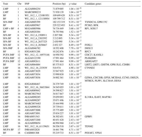 BF, backfat; Chr, chromosome; IMF, intramuscular fat; LMP, lean meat percentage; MUFA, monounsaturated fatty acid; PUFA, polyunsaturated fatty acid; SFA, saturated fatty acid.