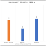 In this study, we investigated the effects of the on-farm-hatching system on the hatching success and early-period chick performance of three different broiler genotypes. There were no significant differences for the hatchability of fertile eggs (hatching rate) and total embryonic mortality, which are accepted as the main indicators of the effectiveness of a hatching system in practical conditions, between the conventional hatchery-hatched (HH) and on-farm-hatched (OH) groups. This was similar to some of the previous findings on the effects of early feeding or on-farm-hatching systems on hatching performance. On the other hand, the hatchability of total eggs and the apparent fertility rate in the OH group were found to be significantly lower than in the HH group, while the hatching time of on-farm-hatched chicks was found to be significantly longer. The lack of a difference in terms of the hatchability of fertile eggs suggests that OH can be used instead of HH in the production. However, the low hatchability of total eggs and the low apparent fertility rate suggest that these traits may have been influenced by unknown or unpredictable factors before hatching and during the first 18 d of incubation. In this study, the hatch window was found to be shorter in the OH group compared to in the HH group. The Ross 308 genotype group had a significantly greater hatchability of total and fertile eggs, a greater apparent fertility rate, and the lowest embryo mortality than those of the other two genotype groups. These rates were found to be better in the HH × Ross 308 group compared to in the OH × Ross 308 group. Contrarily to our findings, hatchability was reported to be, on average, 2.5 % higher with the X-Treck on-farm-hatching system (Hein, 2024). In that study, similarly to our results, Ross flocks exhibited slightly higher hatchability than Cobb flocks with the X-Treck system. In a semi-experimental study using the One2Born on-farm-hatching system, Collin et al. (2024) found that the hatching rate of on-farm-hatching groups (90.4 %) was slightly lower than that of conventional-hatching groups (94.0 %). Kustra et al. (2024) reported that the hatchability of the HH group was 96.4 % compared with 93.9 % and 95.8 % for OL (on-farm hatching on litter floor) and OT (on-farm hatching on plastic floor), respectively. Local Anadolu-T had the greatest embryonic mortality rate among the genotype groups.