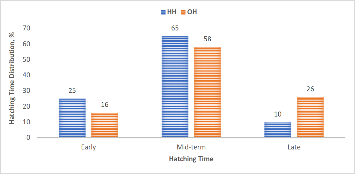 In the study, 65 % and 58 % of chicks in the HH and OH hatching groups, respectively, hatched during a mid-term incubation period of 484 and 501 h. The HH group had a greater percentage of early-hatched chicks and a lower percentage of late-hatched chicks than the OH group (Fig. 1).