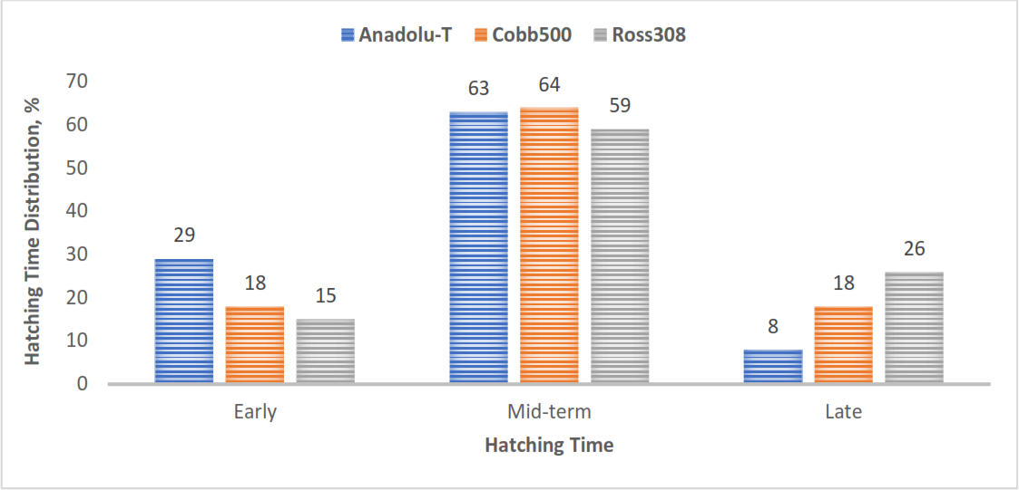 Due to breed-related factors on chick quality, it is essential to consider broiler genotype during the selection of which eggs or chicks to place for production. Egg weight, embryonic metabolic activity during incubation, and genotype are key factors influencing chick quality and first-week mortality (Vieira and Moran, 1998; Hamidu et al., 2007). Recently, a local broiler genotype named Anadolu-T was developed and launched for commercial production in Türkiye (Tagem Arge & Innovation, 2022). The first findings on the overall performance of the Anadolu-T genotype revealed it to be competitive but lower than that of commercial broilers (Erensoy and Sarıca, 2023). These broiler chicks may provide a promising basis for sustainable broiler meat production (Güler and Petek, 2024). However, there is a need for a detailed investigation and response regarding the effect of different hatching conditions and chick quality as compared to commercial genotypes. Chick responses to environmental stressors until the first access to feed and water may differ according to genotype. Therefore, this study was conducted to investigate the effects of the hatchability success rate of varying broiler genotypes in on-farm-hatching systems and their first-week chick performance under experimental conditions.