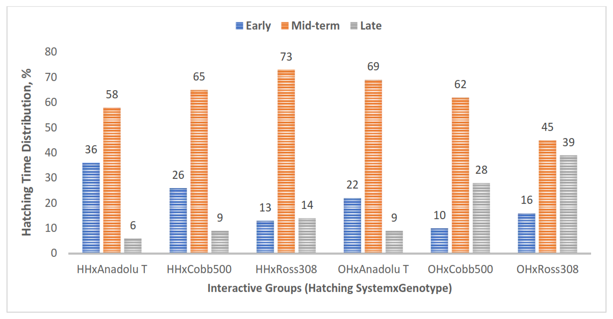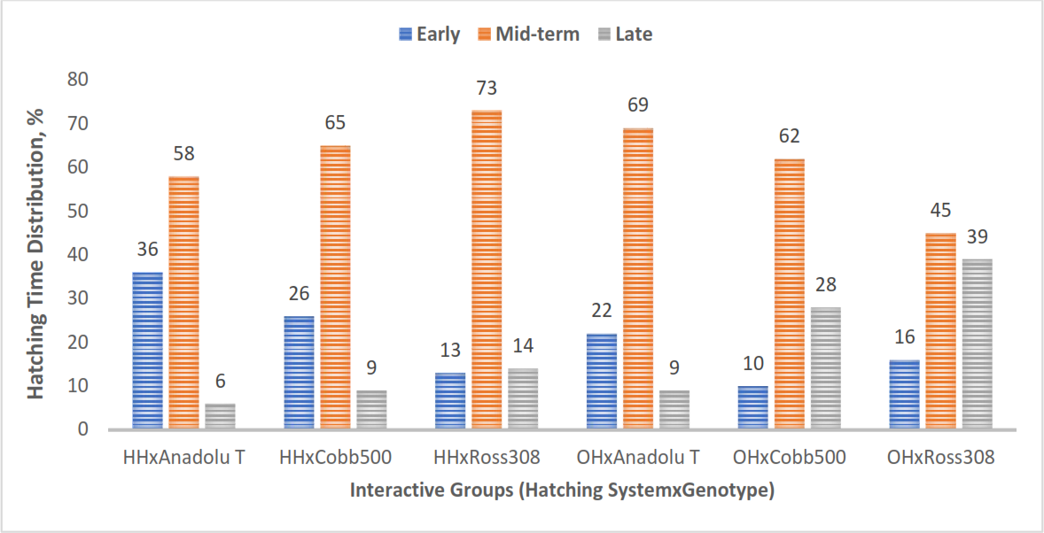 In terms of genotype, 59 %–64 % of chicks from all genotypes hatched during the mid-time interval of 485 to 501 h of incubation. The Anadolu-T group had a higher percentage of early-hatched chicks, whereas Ross 308 had a higher percentage of late-hatched chicks (Fig. 2).