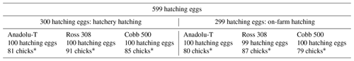 In the experimental growing house, a total of 30 pens were used to assess the first-week performance of the chicks, with 5 pens per group and a maximum of 15 chicks per pen. The experimental pens were 1 m × 1 m in size and equipped with nipple drinkers and chick feeders. They were subjected to the same care and management programme as specified in Turkish legislation for the protection of meat-type poultry (Official Gazette, 2018). The birds received 24 h of artificial light for the first 7 d. No feed and water were provided to the hatchery-hatched chicks until the first access to feed and water, which was 24 h after the hatch window. Subsequently, feed and water were provided ad libitum. All birds in every group received the same feed ad libitum, consisting of maize- and soybean-meal-based commercial diets formulated to meet their nutritional requirements (starter: crude protein = 22 %, metabolisable energy = 2900 kcal kg−1). The feed was provided in crumble form, with a feeder space of approximately 2.5 cm per chick, initially.