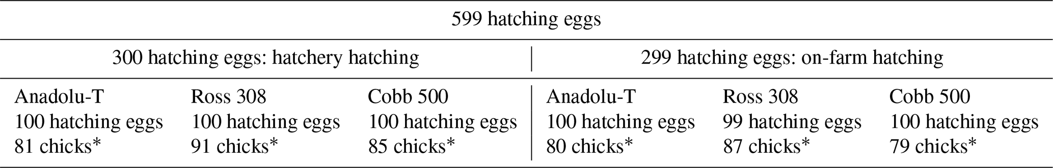 The experiments were performed using a total of 599 first-grade hatching eggs (200 eggs from each genotype, except for Ross 308 with 199; see Table 1) obtained from a commercial breeder company, raising two fast-growing commercial broiler breeders (Ross 308 and Cobb 500) and a Turkish local broiler breeder (Anadolu-T) in standard conditions for broiler breeder (Ross, 2018; Cobb Vantress, 2020). The age of parent stocks used in the experiment ranged from 38 to 45 weeks between the genotypes. The averages for the individual egg weights of Anadolu-T, Cobb 500, and Ross 308 were calculated to be 58.73, 68.72, and 56.88 g, respectively.