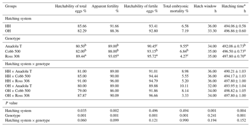 Table 2Effects of hatching systems on the hatching performance of eggs from different broiler genotypes.