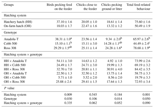 Providing feed and water immediately after hatching is essential to ensure high-quality day-old chicks and enhanced performance (Yeboah et al., 2019). Whether animals receive sufficient feed and water after hatching can be assessed by observing their feeding activity and checking crop fullness. There were significant differences in feeding behaviour between HH and OH chicks. A greater number of HH chicks were significantly more active in feed consumption, with more than 75 % of HH chicks exhibiting total feed-related behaviour during the observation period. This finding aligns with the findings of Giersberg et al. (2023), who reported that hatchery-hatched chicks showed higher activity than on-farm-hatched chicks. The differences in feeding behaviour between the hatching groups may be attributed to the long-term lack of feed and water for hatchery-hatched chicks due to the extended hatch window (36 h) and the post-hatch waiting period (24 h) before access to feed and water. OH chicks exhibited less eating-related activity because they had already had access to feed for 24 h. Contrarily to our findings, Jessen et al. (2021a) reported that feeding behaviour was more frequently observed in OH chicks than in HH chicks at 11 h and 35 h of the post-hatch period. In fact, at the beginning of life, chicks remain inactive for a considerable time before engaging in feeding-related activities. Boyner et al. (2021) reported that only 5 % of chicks were observed eating or standing near the feeder in the first 25.4 h of life, and 50 % of birds had a full crop by an average age of 30.6 h. Under normal hatchery conditions, the shorter the hatch window period, the more active the chicks are (Boyner et al., 2021). Regardless of genotype, the number of birds pecking feed and exhibiting total feed-related behaviour was greater in HH groups across all genotypes. The main reason for the differences in feeding behaviour between the two hatching systems was the very low activity in the OH × Cobb 500 group. Overall, more than 80 % of chicks displayed non-feed-related behaviour during the observation in this group, whereas total feed-related behaviour was observed in more than 58 % of chicks in all other groups (Table 3). This group had the highest day-zero mortality rate (13.9) and the lowest feeding activity (19.79 %), which may be due to the prolonged hatching time and the associated stress, leading to reduced chick quality. Interestingly, the chick quality was the highest in the OH × Cobb 500 group. The fact that this group also had the lowest hatchability of total eggs (79 %) and apparent fertility rate (86 %) suggests that some unpredictable factors before hatching and during the first 18 d of incubation may have had an effect on post-hatch performance.