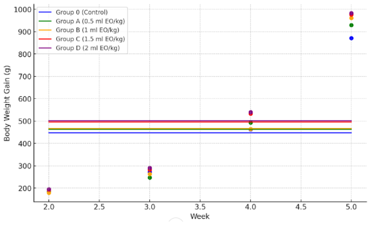 Figure 1Weekly body weight gain of broilers in different treatment groups (Control, 0.5, 1, 1.5, and 2 mL kg−1 essential oil). Data points represent mean values per week, connected by lines for visualization of growth trends.