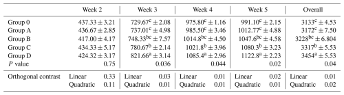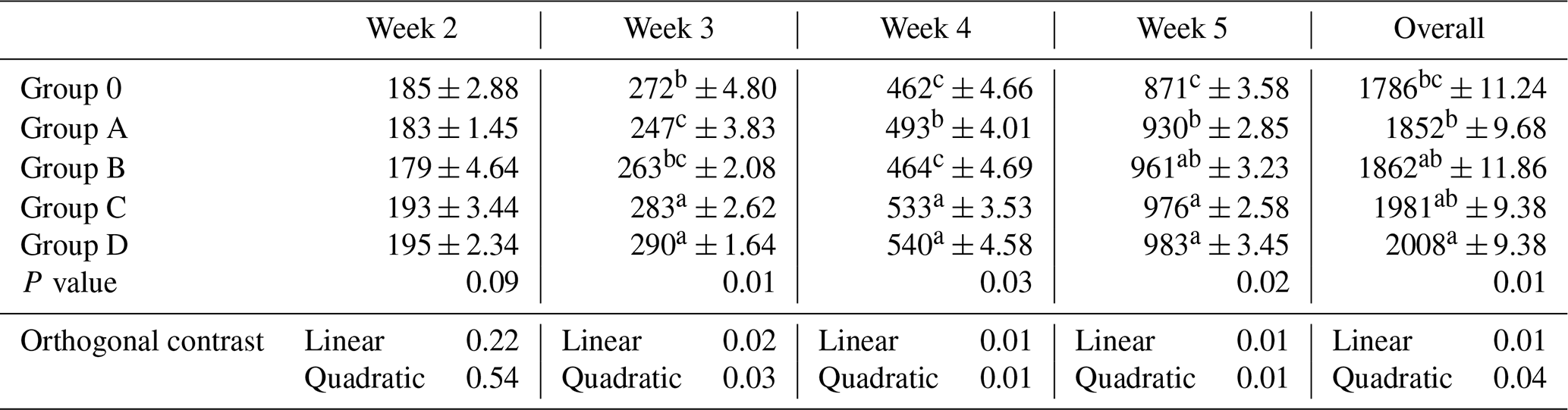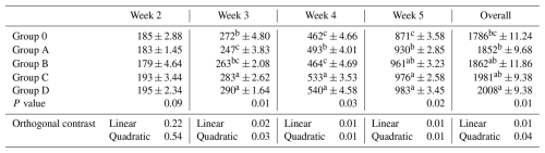 Body weight gain did not differ during week 2 (P= 0.09). Differences emerged during weeks 3–5 and overall (P≤0.03), where Group D showed greater gains than Group O, and Groups C and D generally differed from Group A, while Group B shared categories with both lower and higher groups (Table 3, Fig. 1). Significant linear and quadratic trends were detected (P≤0.04).