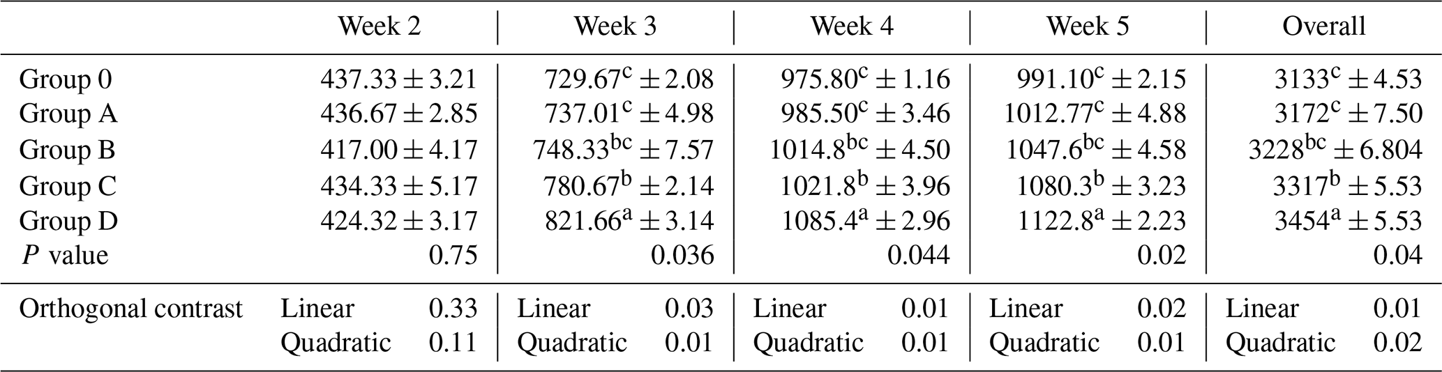 Feed intake did not differ among treatments during week 2 (P= 0.75). Significant differences were observed from week 3 onward (week 3: P= 0.036; week 4: P= 0.044; week 5: P= 0.020; overall: P= 0.040; Table 2). During weeks 3–5 and overall, Group D differed from Group O and Group A, while Groups B and C showed intermediate responses with partial statistical overlap. Linear and quadratic contrasts were significant during these periods (P≤0.03), indicating a graded treatment effect.