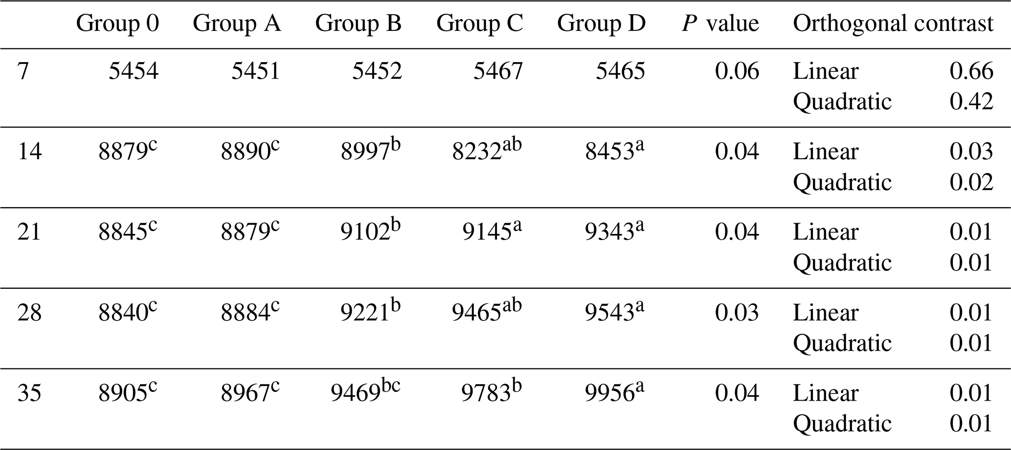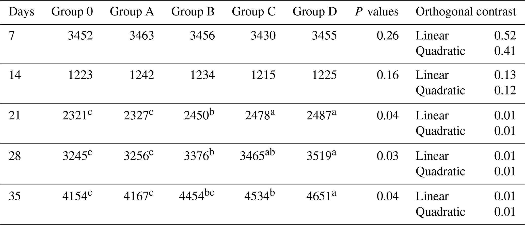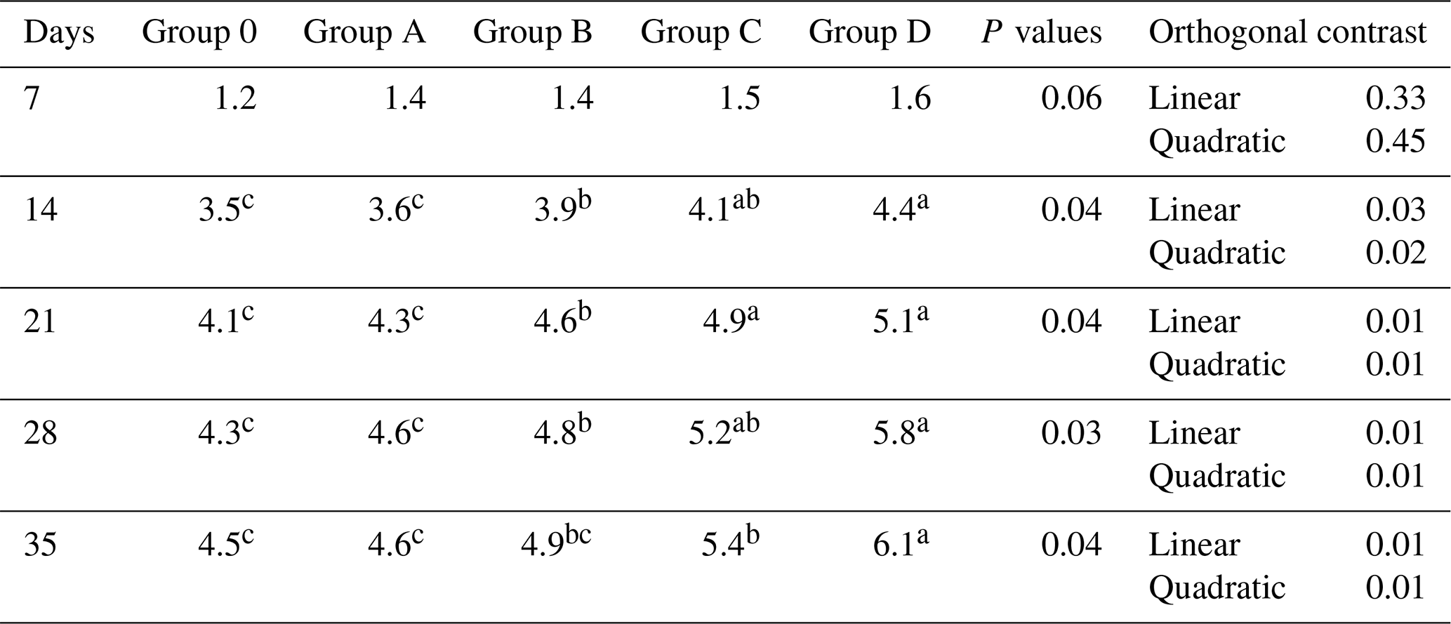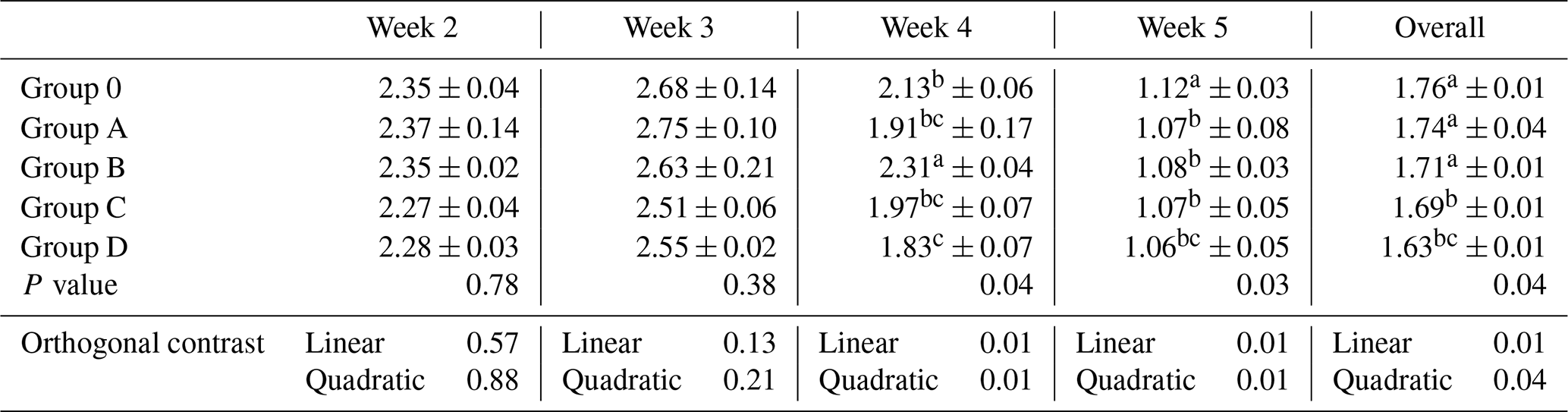 Feed conversion ratio was similar during weeks 2 and 3 (P>0.05) but differed during weeks 4 and 5 and overall (P≤0.04; Table 4). Group D showed improved efficiency compared with Group O, while Groups B and C were intermediate, and Group A overlapped with the control. Linear and quadratic contrasts were significant (P≤0.04).
