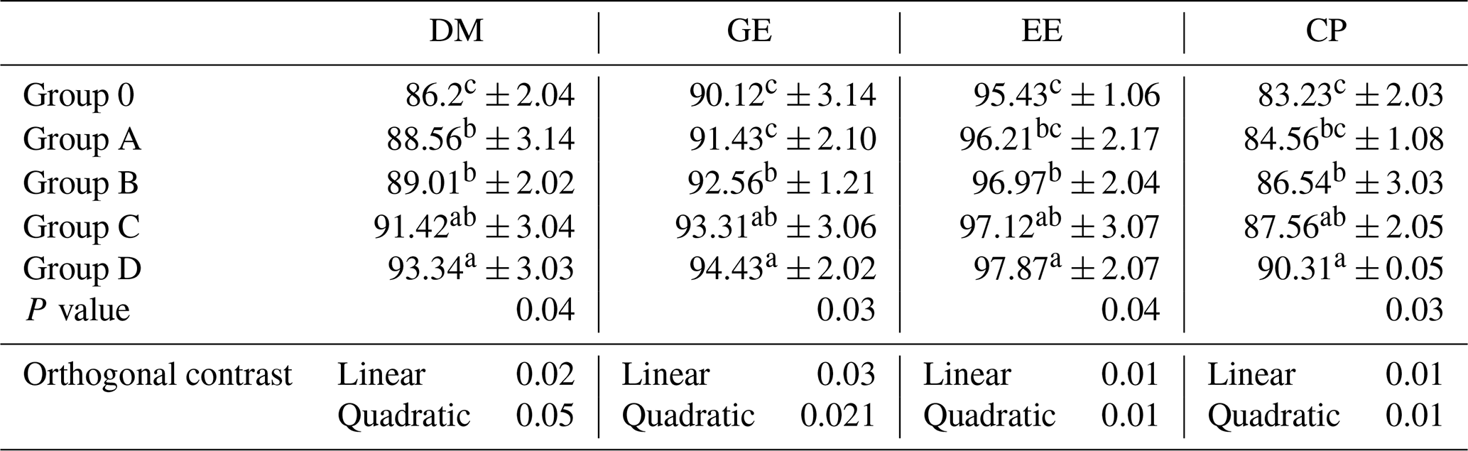 The digestibility of dry matter, gross energy, ether extract, and crude protein differed among treatments (P≤0.04; Table 5). Group D showed higher digestibility than Group O, while Groups B and C exhibited intermediate values, and Group A overlapped with both control and supplemented groups. Significant linear responses (P≤0.03) with supporting quadratic trends were observed.