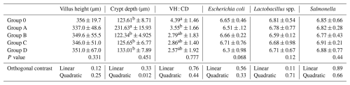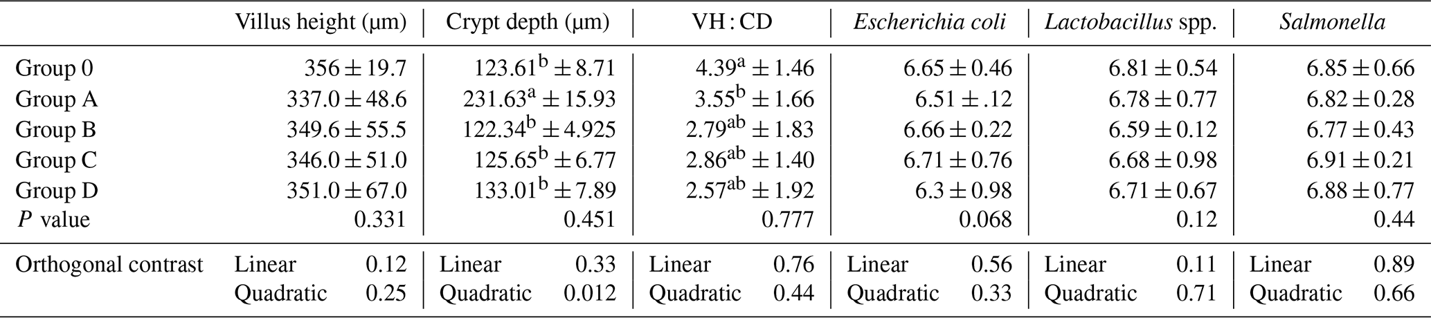 No significant differences were detected among Groups O, A, B, C, and D for villus height, crypt depth, villus height-to-crypt depth ratio, or cecal microbial populations (P>0.05; Table 9). A quadratic trend for crypt depth was observed (P= 0.012), suggesting a non-linear response.