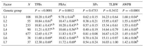 Farrowing year (FY) significantly affected PBAs (P<=0.0049), SPs, TLBW, and AWPB (P<0.0001), while parity number (PN) influenced all traits except SPs (P=0.3524) (Table 1). Genetic group (GG) affected TPBs (P<0.0001), PBAs (P=0.0012), and AWPB (P<0.0001) (Table 2).