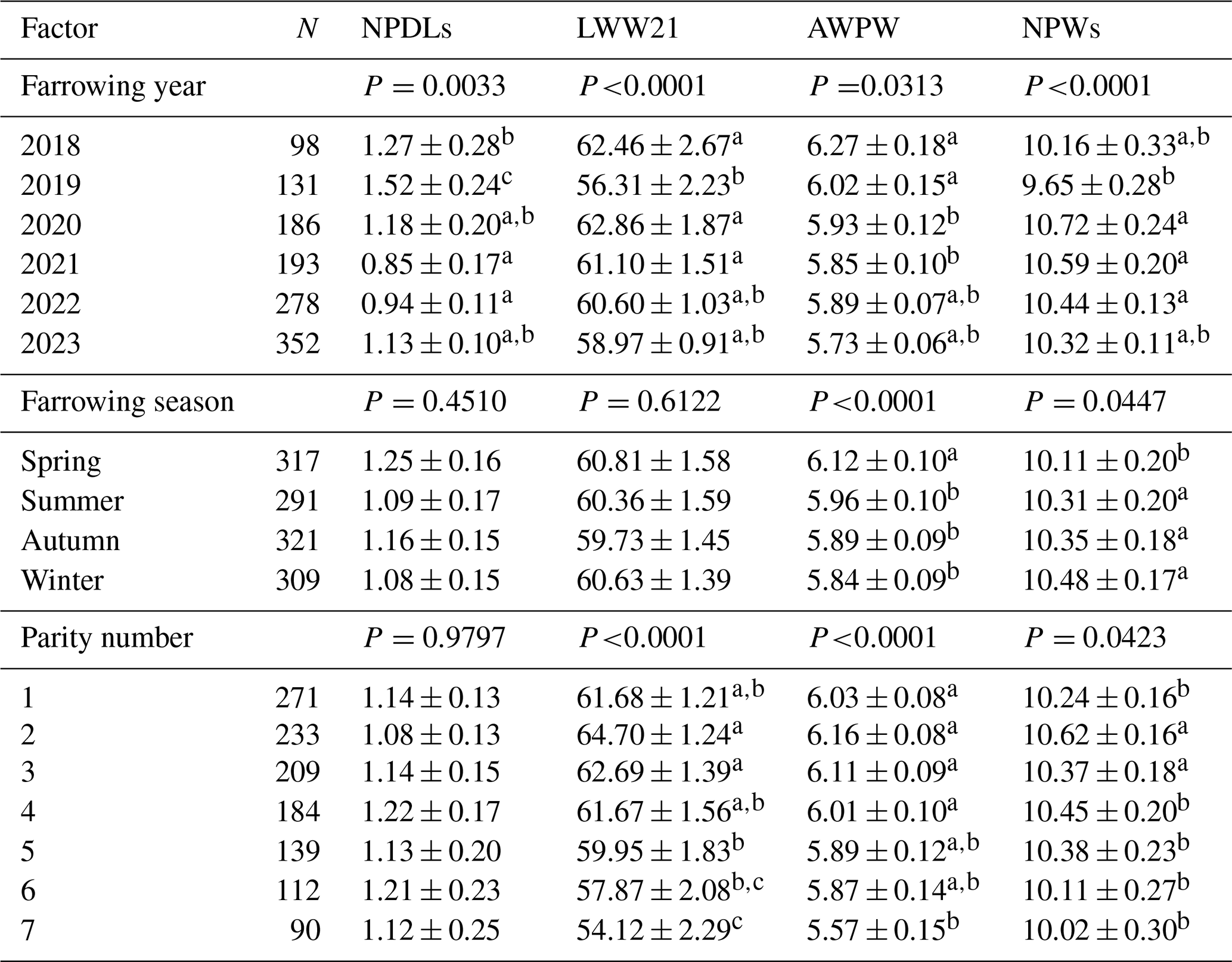 Table 3Least squares means and standard error for preweaning mortality (NPDLs), litter weaning weight adjusted to 21 d (LWW21), mean weaning weight (AWPW), and number weaned (NPWs) in multiparous sows by farrowing year, service season, and parity number.