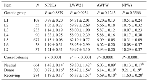 Table 4Least squares means and standard error for preweaning mortality (NPDLs), litter weaning weight adjusted to 21 d (LWW21), mean weaning weight (AWPW), and number weaned (NPWs) in multiparous sows by genetic group and cross-fostering.