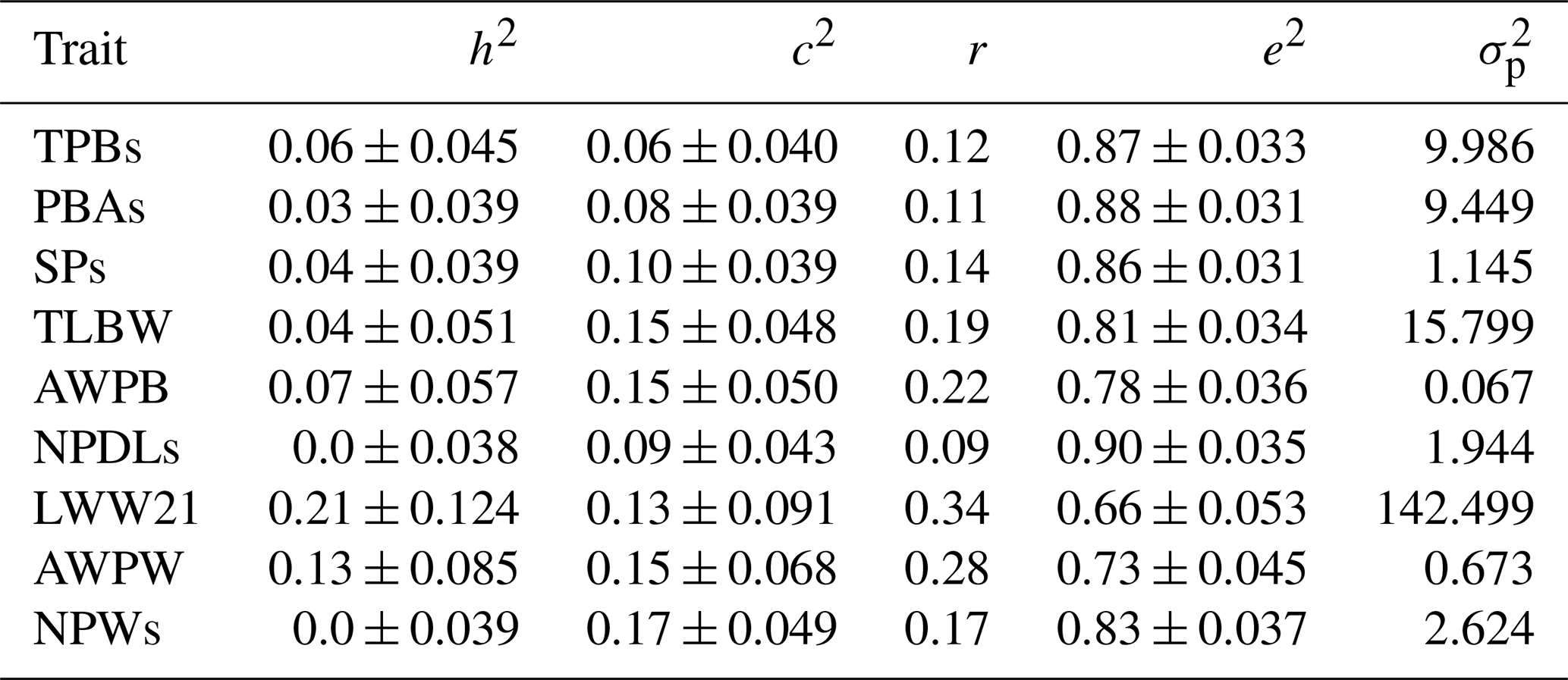 Here h2 is heritability, c2 is the proportion of the maternal permanent variance with respect to phenotypic variance, r is the repeatability index, e2 is the environmental effect related to phenotypic variation, and is phenotypic variance. Total born piglets (TPBs), live-born piglets (PBAs), stillbirths (SPs), total litter birth weight (TLBW), mean birth weight (AWPB), preweaning mortality (NPDLs), litter weaning weight adjusted to 21 d (LWW21), mean weaning weight (AWPW), and number weaned (NPWs).