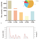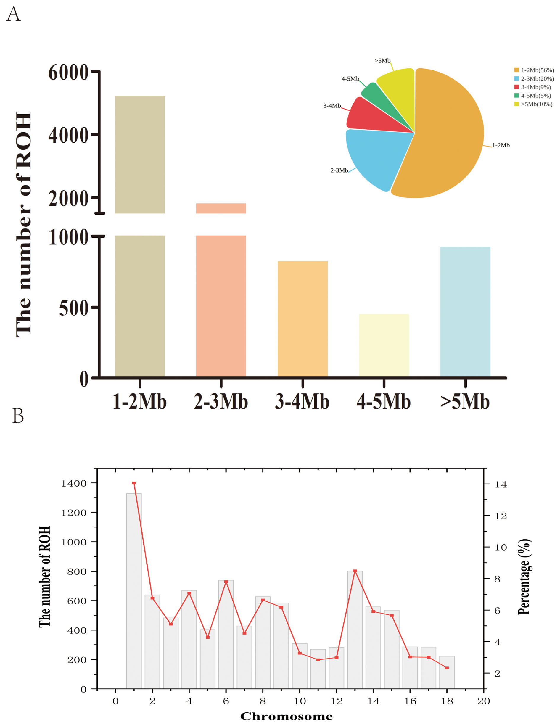 Figure 1Number of ROH segments in the Danish LW pig population. (A) Number of ROH of different lengths. (B) Number of ROH in chromosomes. ROH=runs of homozygosity.