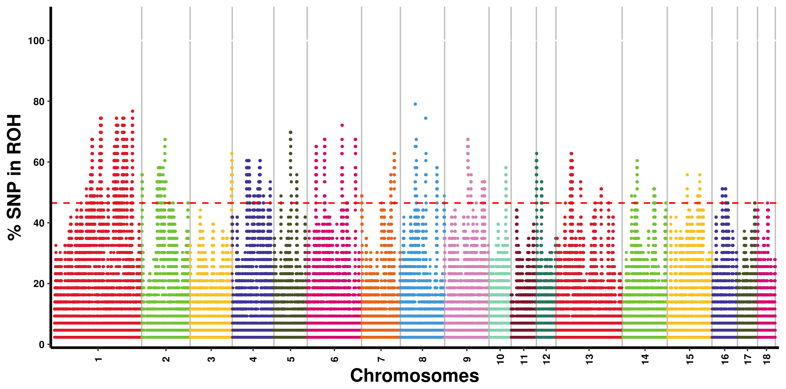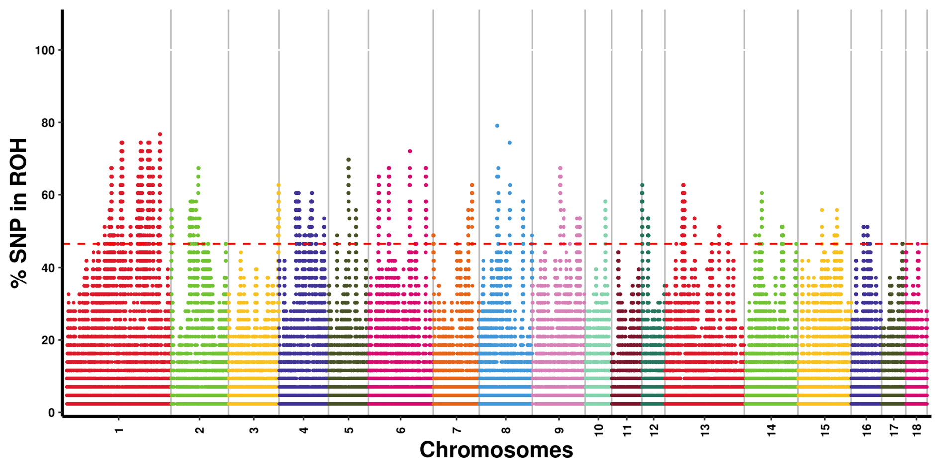 Figure 2Manhattan plot of SNP incidence for ROH across individuals in the Danish LW pig population. SNP=single nucleotide polymorphism; ROH=runs of homozygosity; LW=Large White.