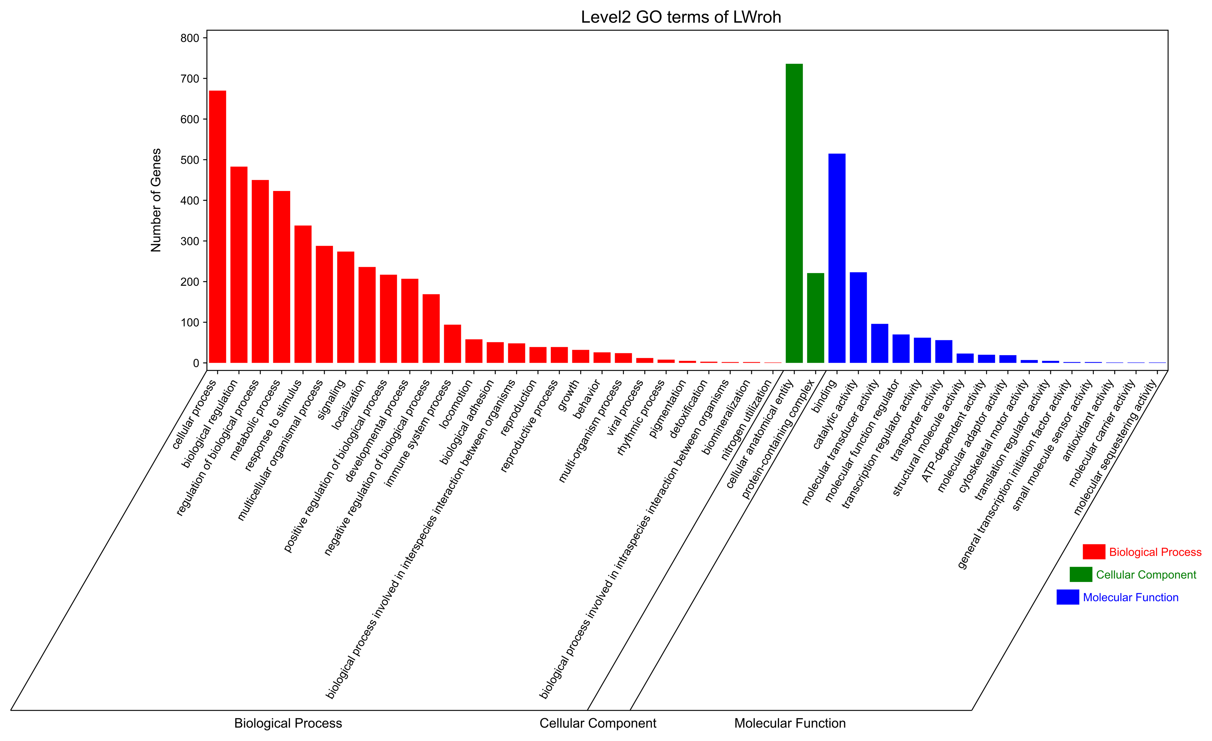 Figure 3GO terms analysis of the candidate genes located in the Danish LW pig ROH islands. GO=gene ontology; LW=Large White; ROH=runs of homozygosity.